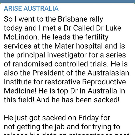 So I went to the Brisbane rally today and I met a Dr Called Dr Luke McLindon. - ARISE AUSTRALIA telegram